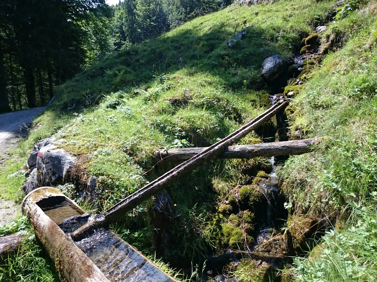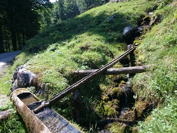 Der Aufstieg zur Alp Aberen beginnt. Hier fülle ich meine Flasche. Bis zur Alp gibt es einen Fahrweg.